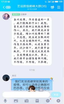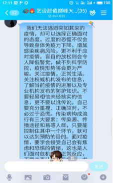 17级艺术史论班团支部组织于3月18日上午开展了一次关于“我的专业能为抗疫做什么”的主题团日活动。首先将艺术史论专业的专业理论学习融入到活动过程终,其次龙晓云、刘金涛同学积极发言分享抗疫故事,最后邀请任谢元老师点评有关疫情传播路径和公众素养的桌面调研报告。王玉婷同学:我们希望文字的力量吹醒每个人对于疫情传播路径的认识,深切感受到公民素养与时代传播路径的息息相关。从我做起,传播科学知识,共同抗击疫情。