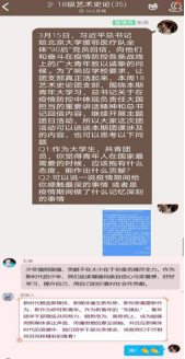 18级艺术史论团支部围绕总书记在疫情防控中体现负责任大国担当的重要讲话精神开展了本次主题团日活动.团支书在班级QQ群带领支部成员学习“习近平总书记给北京大学援鄂医疗队全体“90后”党员回信”的内容. 同学们分享了自己在疫情期间感触最深的的事情,并认真思考了在国家需要的时候,自己抱有的态度和能做出什么贡献的问题。最后,讨论在意犹未尽中结束。作为当代青年,应于疫情中见贤思齐焉,用实际行动为坚决打赢疫情防控人民战贡献自己的青春力量!