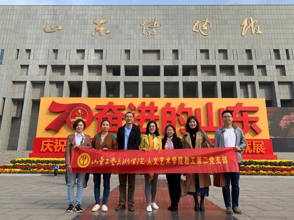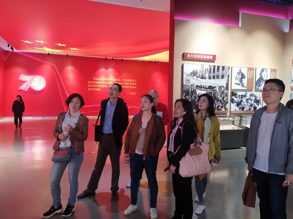 2019年10月12日上午9:00,人文艺术学院教工二支部党员苏葵、安峰、朱小尧、王红莲、李振、毛樱洁,由支部书记刘娅萍领队,至山东博物馆,观看“奋进的山东——庆祝中华人民共和国成立70周年成就展”。在博物馆工作人员、永利官网古籍修复课程外聘教师鲁元良的带领和讲解下,了解了展览构成、内容及形式等展览基本要素,对展览中有深刻记忆的科技、教育、经济、文化艺术发展等方面的大事件引发了诸多感慨和讨论,更是对“不忘初心、牢记使命”的教育主题有了更为深刻的认识和体会,寻回初心,回到本源,践行使命,布局未来,是观展党员的共同感受。