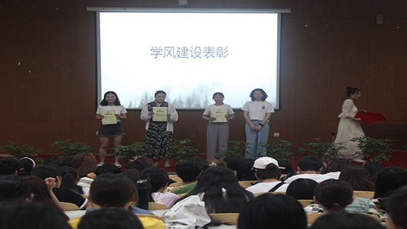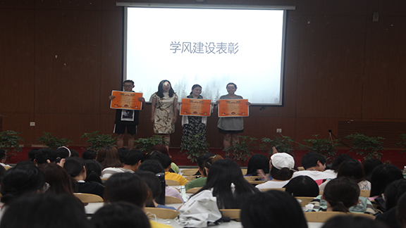 闭幕式伊始,读书月活动参加者张玥同学和张钰彬同学分别进行了书目推荐,分享了她们在读书过程中的心得体会和收获。随后,活动进入颁奖环节,主持人宣布了读书月先进个人的获得者和读书月三行诗获奖名单,老师们为他们颁奖。活动最后,学院对2018-2019学年第二学期早操晚自习先进个人、学风建设优秀个人奖的获得者、学风建设优秀班集体的获奖班级进行了表彰和颁奖。