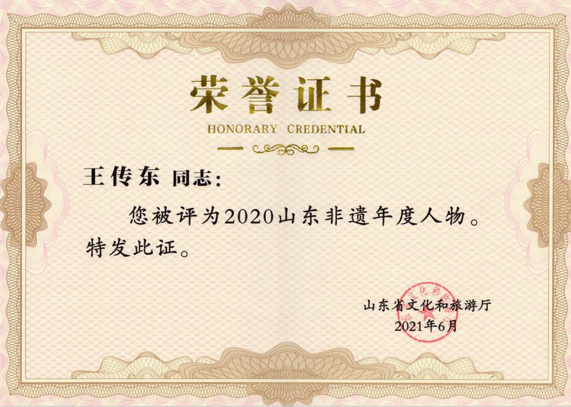 永利官网社区艺术大学常务副校长王传东教授(原继续教育学院院长)在非遗传承与保护、传统工艺创新设计、齐鲁优秀传统文化的创造性转化、创新性发展等方面做了大量工作,尤其是在非遗培训人才培养、活动组织、工作站建设、培训成果转化、文创产品研发、非遗知识普及推广等方面成绩突出,经省厅组织专家评审,获评“2020山东非遗年度人物”。