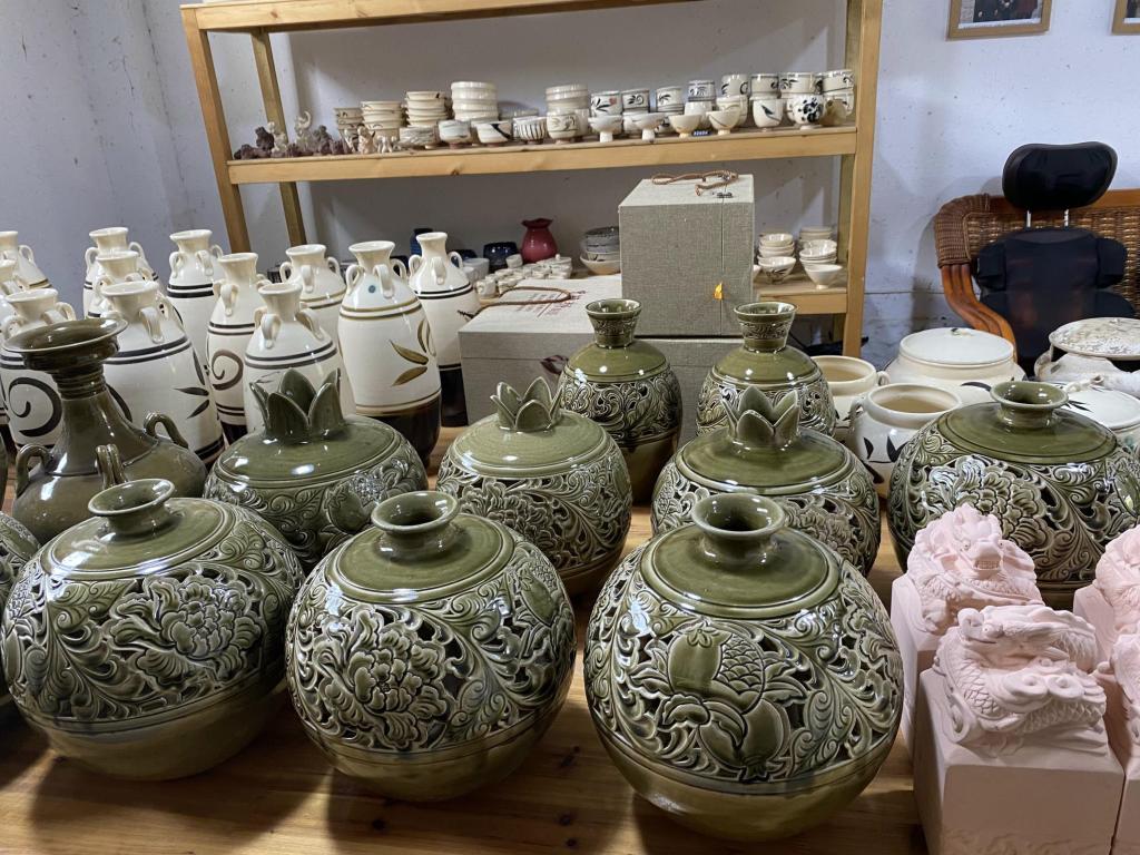 他复烧的隋朝中陈郝陶瓷代表作是盘口壶、四系罐等,隋青瓷古朴典雅,光彩照人,现在他又利用北方传统图案和枣庄元素进行创新,探索镂空工艺,创作出了石榴多福瓶等。刘兵的作品屡次获奖,在2020年第十二届中国(山东)工艺美术博览会上,《剔花蒜头瓶》和《黑花梅瓶》分别荣获精品奖金奖和设计创新奖银奖。
