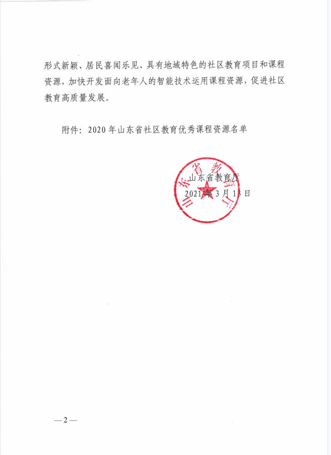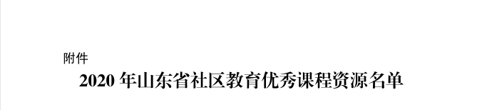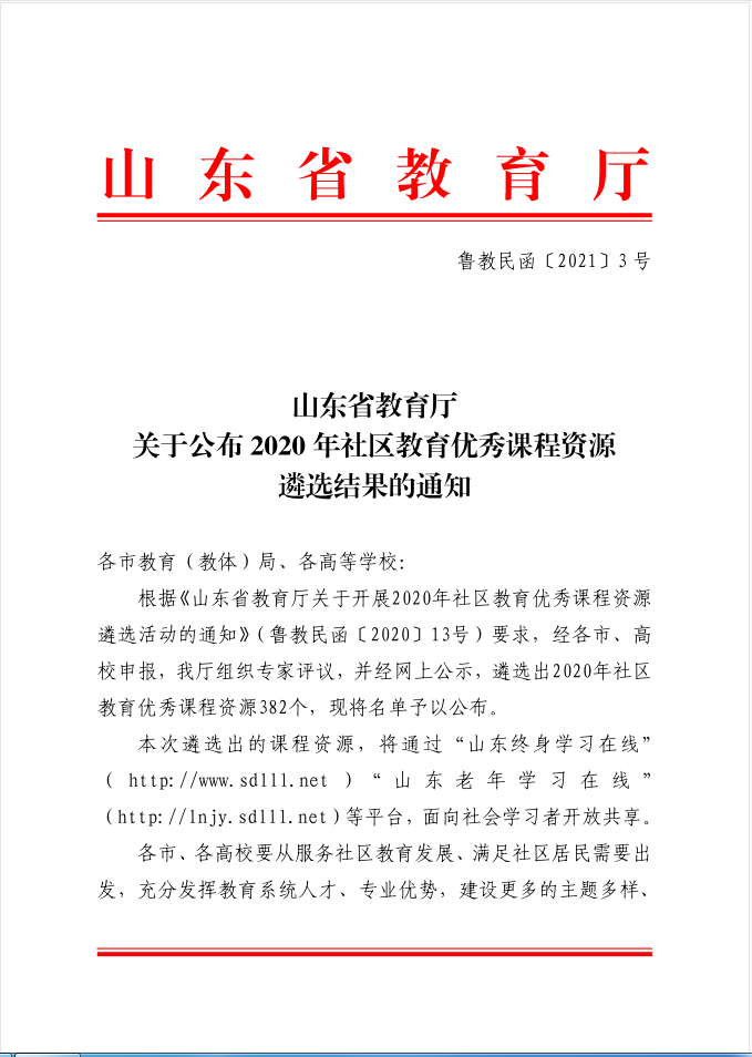 为进一步落实《山东省教育厅等9部门转发<教育部等九部门关于进一步推进社区教育发展的意见>的通知》 (鲁教民发〔2017〕1号)精神,丰富我省社区教育优质课程资源建设,提升社区教育发展内涵,满足社区居民多样化、个性化学习需求,省教育厅下发了《山东省教育厅关于开展2020年社区教育优秀课程资源遴选活动的通知》(鲁教民函〔2020〕13号),根据通知要求,继续教育学院(社区艺术大学)积极组织本部门教师申报社区教育课程。经省教育厅专家评审、公示,我院申报的课程共有4门课程入选省级社区教育优秀课程。