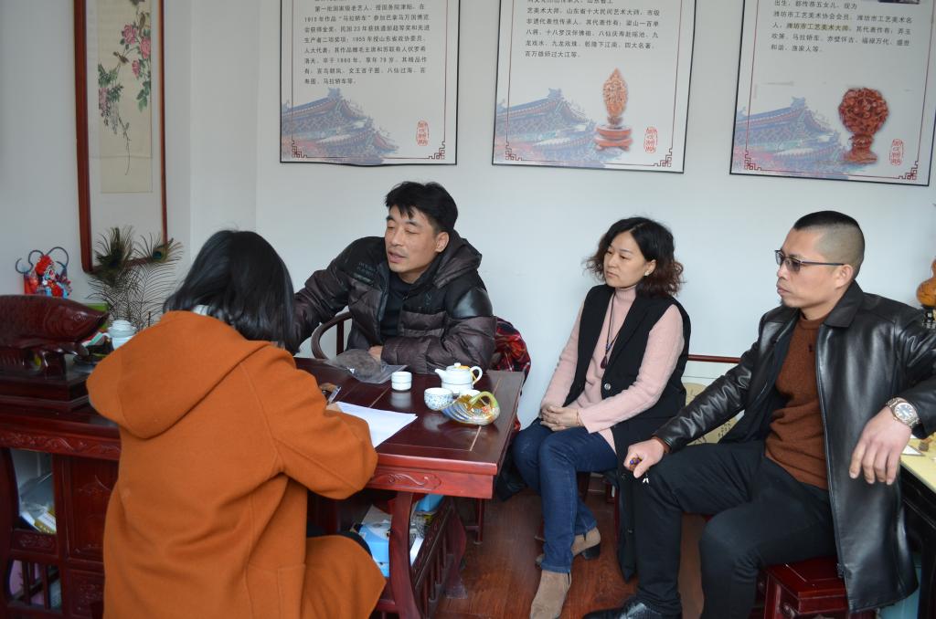 回访第二站来到学员孙业刚的工作室。孙业刚是潍坊核雕传承人邢友弼的徒弟。刑老师于2007年建立“邢式宫廷”核雕品牌,坚持传统操刀技法。孙业刚成立有“矩核堂”工作室,营销方式除了传统的店面展厅之外,还有网络营销方式。通过非遗培训学习开拓了眼界,在核雕创作时加入其他材质,做镶嵌工艺的摆件取得了很好的效果,并突破传统船的题材,结合时代做红色文化题材“红船”。希望新的一年和政府进一步合作,做好面对全国的核雕展销平台。
