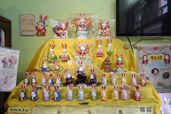 2月8日上午,回访了玩具技艺培训班学员杨峰。2004年起他专注于中国民间艺术和旅游纪念品的创作。为了留住在济南有着悠久历史却又濒临消失的传统泥塑艺术—“兔子王”,经搜集整理相关资料、细心研究后,在继承传统的基础上创作了融合中国的月亮文化和济南的泉水文化,极具地方特色的“泉城兔子王系列作品”。