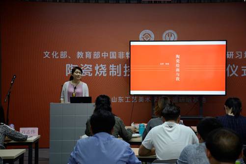 交流中,孙佳以《陶瓷绘画与我》为题详细讲解了陶瓷绘画相关知识,陶瓷彩绘艺术的分类、釉上、釉中及釉下彩绘的工具材料、彩绘的基本技法等。