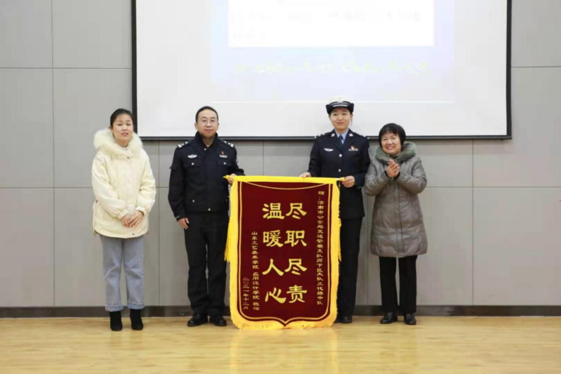 最后,由应用设计学院院长侯立平为两位警官赠送了“尽职尽责,温暖人心”的锦旗。