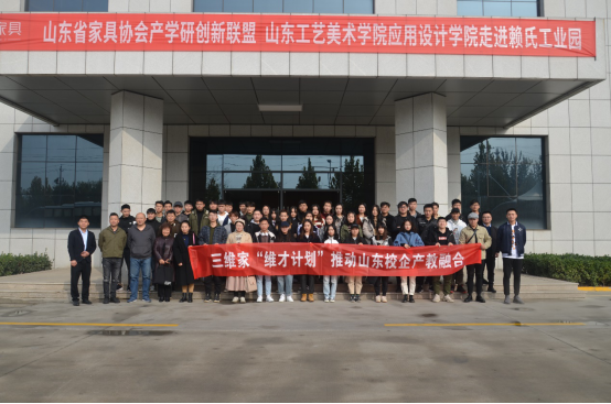 11月8日,为促进产教融合项目深入合作,304am永利集团官网应用设计学院家具设计教研室师生考察赖氏家具集团产业园, 院长侯立平教授、教研室主任黄永健副教授、刘蕊老师以及山东艺术设计职业学院聂红兵教授带领学生详细考察了各类生产车间,赖氏家具陈岭副总、设计总监宋洁等对企业概况、人才需求进行了介绍,双方就日后合作事宜交换了意见。