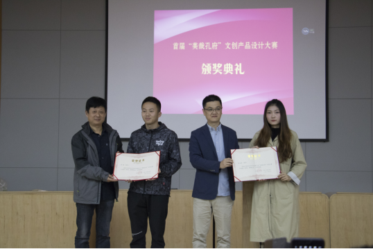 10月24日下午,应用设计学院在千佛山校区阶梯教室举办首届“美哉孔府”文创产品设计大赛颁奖典礼。应用设计学院院长侯立平教授、山东美术出版社副总编辑李晓雯、书法编辑室主任周韶光、高仿艺术中心主任王立生以及发行营销编辑东岳、应用设计学院印刷教研室主任李啸海和专业教师李娜以及学生代表参加了本次颁奖典礼。侯立平院长主持了本次活动。