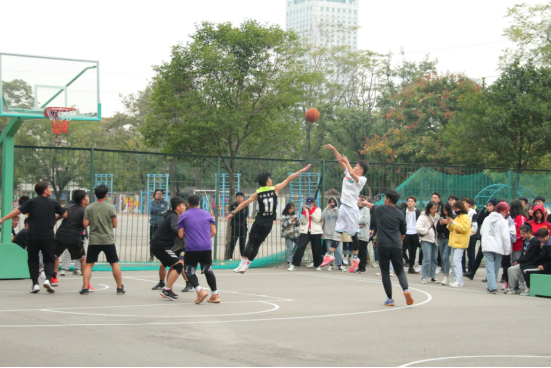 此次比赛共分为两个赛队,由2019届新生和2018级学长们组成的两支队伍狭路相逢,在应用设计学院的篮球场上进行了激烈的篮球碰撞,吸引了许多同学前来观战。