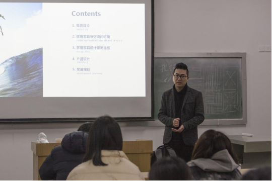 讲座中曹振强主管分别从集团介绍、医用家具与空间的运用、医用家具设计研发流程、产品设计、发展规划等板块进行讲述。曹振强主管介绍了集团的主要成员与基本情况,对集团的发展历程进行了概述。随后,曹振强主管从医用家具与空间运用的角度,从医疗、空间、舒服、人性、功能、行为、外观、工艺、结构、材料、实用等方面,介绍了医用家具的研发前景及设计关注点,并通过集团产品的实际案例向同学们讲解了医养系统中家具的形式与特点,如从整体的空间规划到家具的运用的护士站,输液室,听诊室等家具的设计要点。同时曹振强主管还将产品设计流程贯穿其中,从行业研究、产品梳理、信息收集、新产品规划、立项书评审、新产品规划、图册制作到新产品推广与培训,再到最后的新产品市场反馈,为同学们今后在家具设计的过程中规范了方法,提供了多角度不同的设计思路。