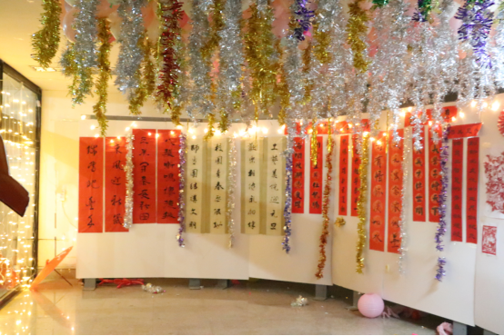 社团部成员提前将场地布置好,在八点钟全体成员到一楼大厅参与活动。小展厅内展示了同学们的贺卡、春联、马勺、剪纸等作品,精美的小礼品和光彩四射的彩灯将整个大厅装饰的美轮美奂,弥漫着节日的气氛。现场还有抽奖等环节,整个大厅人声鼎沸,热火朝天,每个人都兴致勃勃在每个作品前面认真观看,并为自己喜欢的作品投上宝贵的一票。