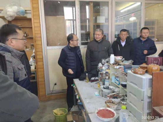 董占军和相关部门人员先后实地查看了数字艺术与传媒设计实验中心数字演播厅、手工艺实验中心漆艺实验室、首饰实验室、金工实验室、纤维染织实验室、陶瓷实验室等。实践教学中心主任张伟及各实验室教师对实验室日常运转、教学、危化品管理以及疫情防控等方面的情况进行了现场介绍。走访调研过程中,同行人员参观了现代手工艺术学院的课程作业展,董占军对学生作品给予肯定并鼓励师生多搭建网络平台协同课程内容。