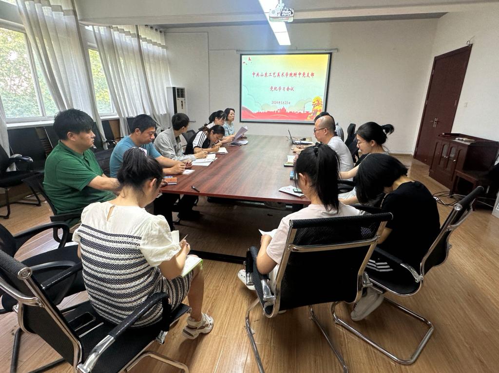 5月23日上午附中党支部在三楼会议室组织开展党纪学习教育。本次学习由附中党支部副书记尚慧主持,附中党支部书记耿玉出席会议,附中副校长孔大健列席会议,附中全体党员参会。