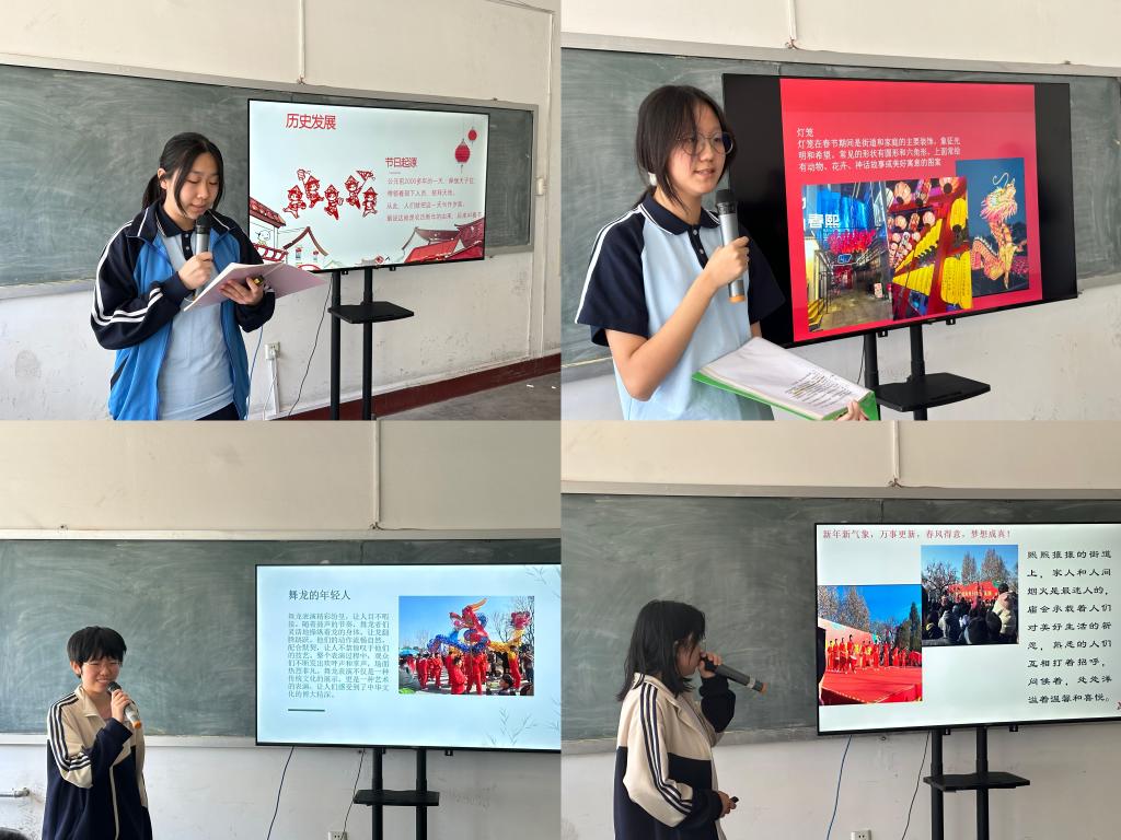 “我眼中的春节”社会艺术实践作品展示拉开了活动的序幕。四位同学精神饱满,用抑扬顿挫的语调和丰富的感情向大家展示了自己的作品。师生和家长们沉浸其中,认真体会和感受优秀传统文化的丰富内涵和民俗文化。随后,谷强老师对学生的作品进行了点评,肯定了学生为作品所做的努力,并表达了对各位同学的鼓励和期许。