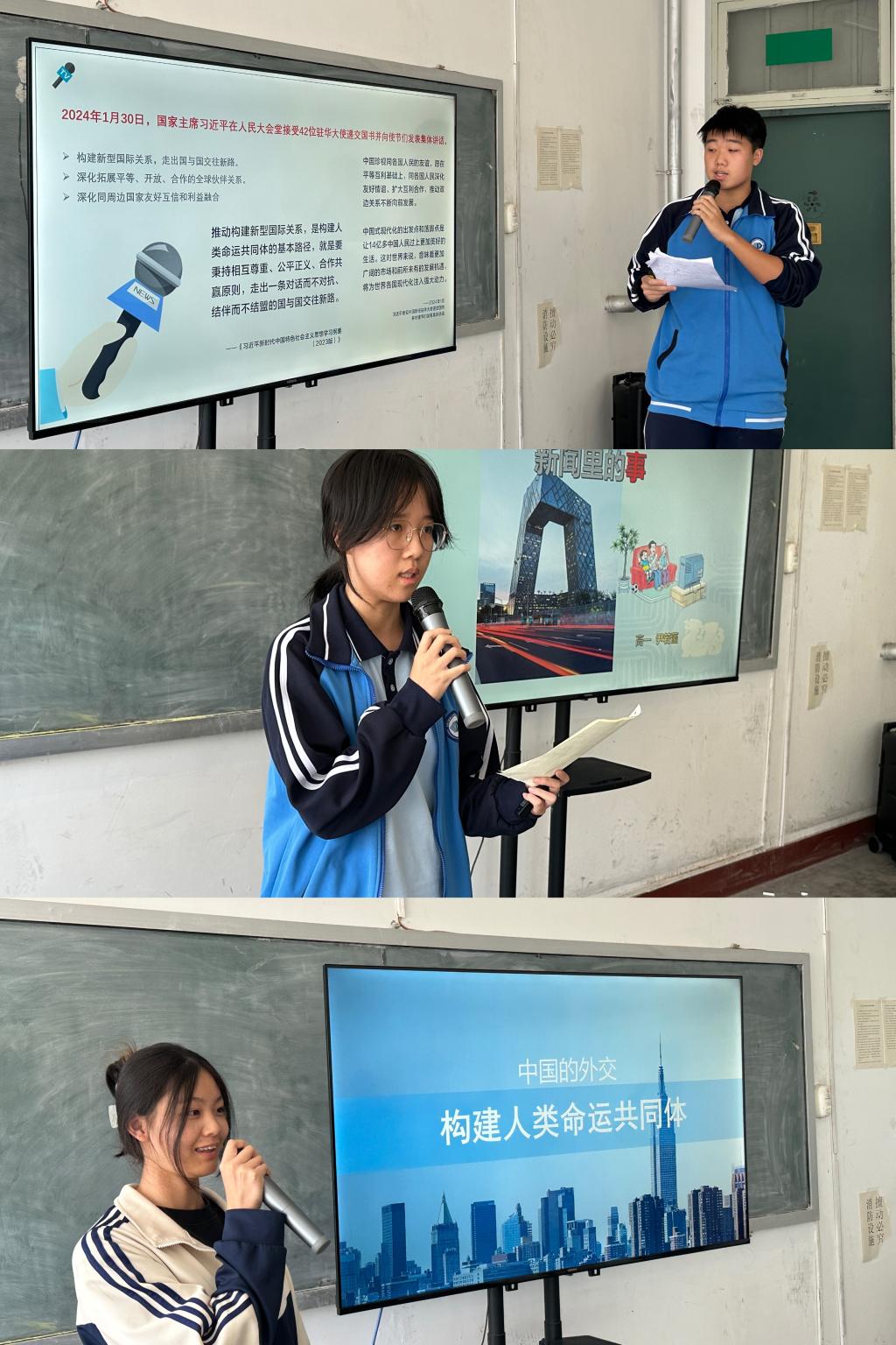 短暂的视听体验之后,继续进行“做个有思想的新闻家”作品展示。三位同学的作品图文并茂,逻辑清晰,充分展示了自身政治素养以及搜集信息、思考问题和总结分析的能力。