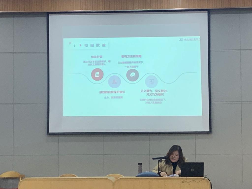 首先,张律师对校园欺凌进行了名词解释,给同学们分析了真实案例并普及了相关法条,告诉同学们当被欺凌时要尽力自救并及时报告,增强自我保护意识;当发现有同学被欺凌时,要“见义智为”,在保护好自身的前提下,解救同学;其次,张律师还告诉同学们网络不是法外之地,同学们需铭记在网络中要做到“心中有戒”,“心中有节”,“心中有界”;最后,张律师强调了疫情防控相关法律问题,告诫同学们要遵守防疫政策,保障自身安全。