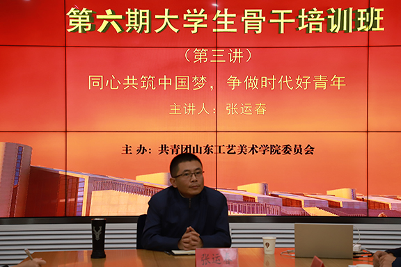 王伟杰老师总结发言,他指出,张老师的演讲饱含激情又不失幽默,信息量极为丰富,听后深受鼓舞和触动。他要求全体学员珍惜当前来之不易的社会环境,利用好各种宝贵平台,团结带领工美学子,勤奋学习,积极工作,发挥青年学生的独特优势和巨大能量,为更好地服务学校发展、服务师生做出应有的贡献。
