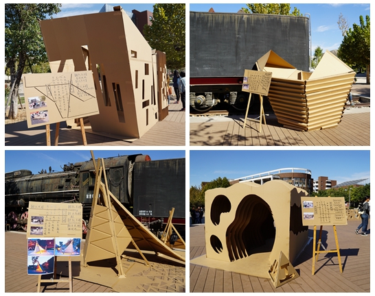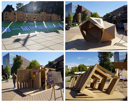 本届“筑梦”创意纸板搭建大赛以“我的空间我的家”为设计主题、绿色环保为理念,要求学生用纸板在一个六平米的面积内进行建筑设计及建造活动。参加本次比赛的八支队伍分别来自视觉传达设计学院、建筑与景观设计学院、工业设计学院,他们通过努力将自己最满意的搭建作品展现在评委和观众面前,带给大家巨大的视觉冲击感。作品中既有以光为主题,围合空间,多面镂空的设计,也有以色彩点缀、纸板围合的方式,环保与现代艺术相结合设计,还有图形排列的方式,圆柱状穿插的设计,同学们巧妙地设计在各个作品中得到展现,得到参会领导和评委的一致好评。本次大赛突出环保理念,在会场布置,作品介绍展板的制作中,都采用了比赛剩余的材料完成,既节俭又美观,富有新意。在此过程中,校领导深入各支参赛队伍与之交流,了解每个参赛作品独特的设计理念,并对材料、造型等提出了一些建议。评委们对每个作品都提出了自己独到的见解,也从专业角度给予了深入的点评。经评委评定,作品《繁星秋水》获得一等奖,作品《时光隧道》、《驻》获得二等奖,作品《简顾》、《Design me》获得三等奖。比赛在喜悦的大合影中落下帷幕。