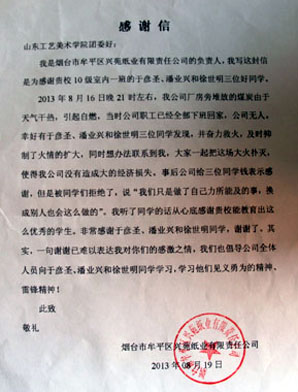 8月26日晚21时,烟台市牟平区兴苑纸业有限责任公司的厂房堆放的煤炭突然起火,火势迅速蔓延,永利官网学生徐世明、于彦圣和潘业兴三位同学及时发现了火情,事发时间较晚,该企业所有员工都已经下班离开,三名同学第一时间联系到企业负责人,并根据造纸厂周围的环境,冷静分析火势,奋力救火。在持续了两个多小时的奋力救火后,几位实习生和中途赶来的工作人员齐心协力将大火扑灭,帮公司挽回了数十万元的损失,厂房中的材料大多数被完整保存下来。他们的见义勇为的事迹给当地企业领导和员工心中留下深刻的印象。实习工作结束,烟台市牟平区兴苑纸业有限责任公司为感谢几位同学的见义勇为事迹向学校团委发来了表扬信和感谢信。