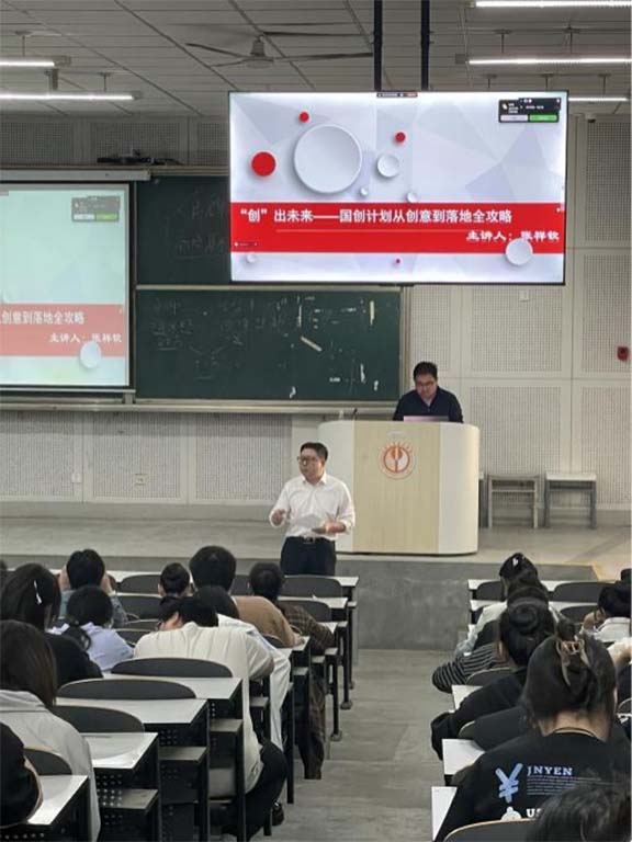 张祥钦围绕《“创”出未来—国创计划从创意到落地全攻略》主题,结合自身丰富的理论知识与实践经验,讲解大学生创新训练计划项目实施全过程。张老师特别强调选题要紧密结合社会需求与专业特色,鼓励同学们立足实际,挖掘具有创新性与可行性的研究方向;在项目规划环节,详细阐述了如何制定科学合理的研究计划,确保项目有序推进;对于项目实施过程中的关键问题与解决策略,张祥钦也结合典型案例进行剖析,为师生们提供了极具参考价值的实践指导。