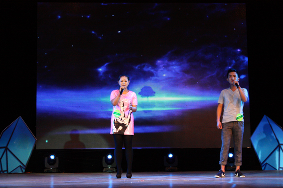在灯光与微笑构成的舞台上,在歌声与笑声交织的篇章里,光焰队、恒星队、星光队的全体队员带来了震撼全场的开场秀,精彩的开场演出吸引着观众们对接下来节目的期待。比赛分为三轮,第一轮,每队各派一名选手进行PK对决,星光队带来的《像梦一样的自由》热情澎湃,取得了最高成绩;第二轮比赛两两对战,光焰队凭借自身的实力领先全场。接下来,主持人从群众中随意抽取两名观众唱响我们的校歌《设计师的摇篮》,将歌曲完美的展现给现场观众,自发的掌声连绵不断,流露出对母校的无限祝福,同时将今晚的比赛推向了高潮。