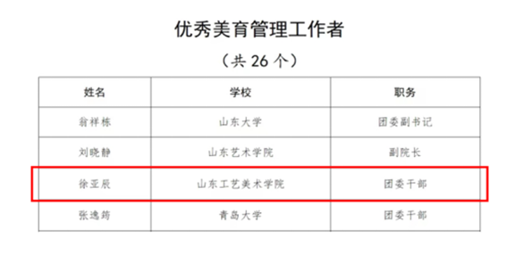 永利官网荣获“优秀组织奖”,并在此次活动中斩获20个奖项,包括校长风采奖2项、一等奖10项、二等奖6项、三等奖2项,获奖作品涉及书法、摄影、设计、绘画、微电影、艺术实践工作坊、高校美育改革创新优秀案例奖等多个组别。永利官网团委社团管理部部长徐亚辰荣获“优秀美育管理工作者”称号。