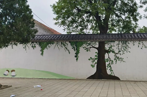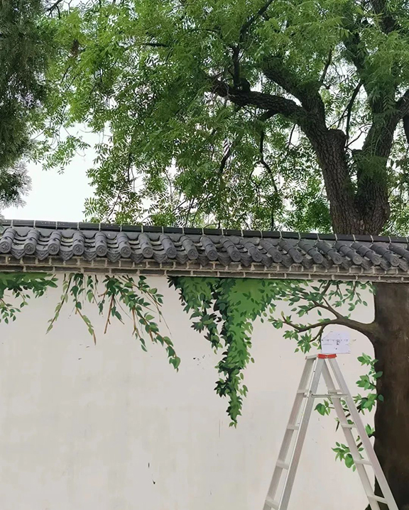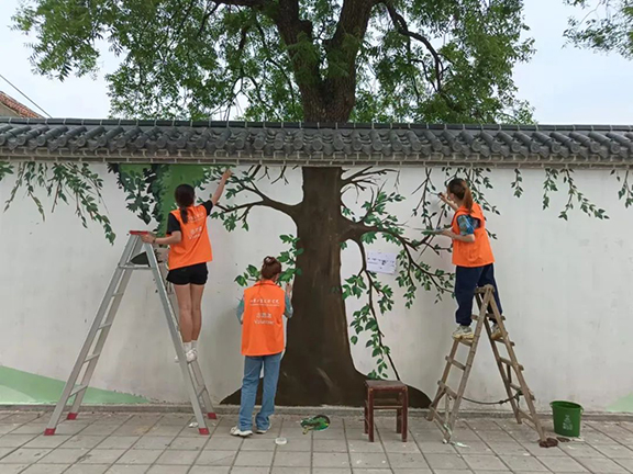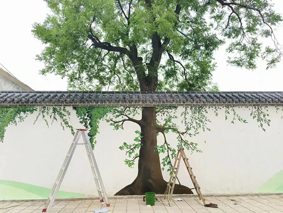 在炙热的阳光下,志愿者们用轻盈的笔触,勾勒出繁茂的参天巨树,辛勤的劳动人民。绘制完成后的画面与墙后的树木完美贴合,没有繁多的装饰,却生动的展现了乡村的秀丽风景与淳朴生活。