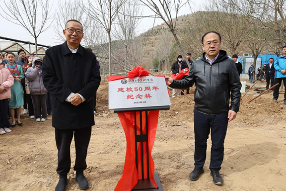 潘鲁生、董占军共同为建校50周年纪念林进行揭牌。
