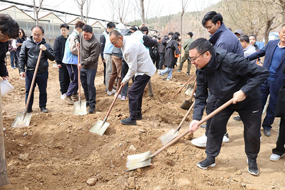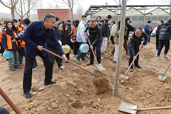 副院长董占军致辞。他指出近年来,学校深入贯彻落实习近平生态文明思想,厚植绿色发展理念,多措并举推动绿色校园建设,将生态文明理念融入学校各项工作,学校获得2022年度“山东省绿色学校”荣誉称号。“十年树木,百年树人”,恰逢学校建校50周年,学校始终坚持“以特色求发展”的办学理念,坚持“为人民而设计”的艺术使命,为社会培养了一大批创新型应用设计人才。作为学校发展历程的亲历者、见证者倍感有幸。铭志于树、寄情于林。他号召大家一起种下象征着建校50周年的50株树苗,携手共创学校新辉煌。最后,他勉励山工艺青年学子要扎根时代土壤,仰望星空,勤奋学习,用奋斗绽放梦想之花。