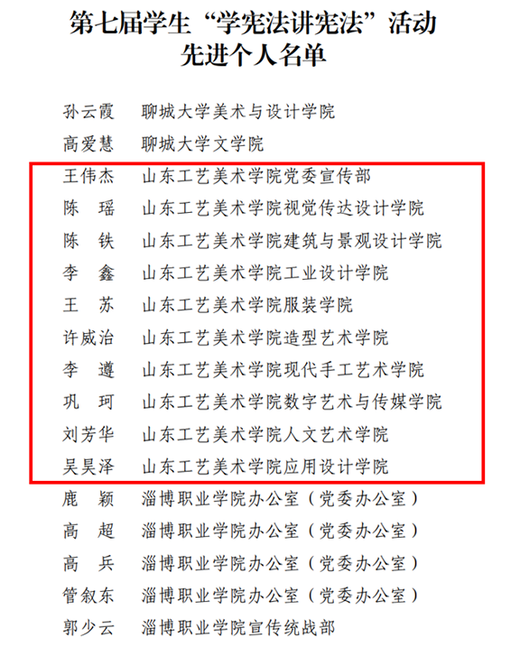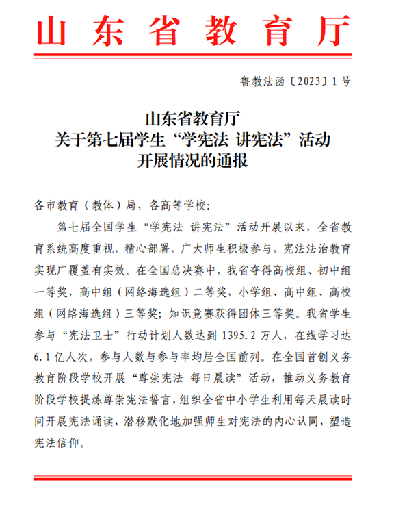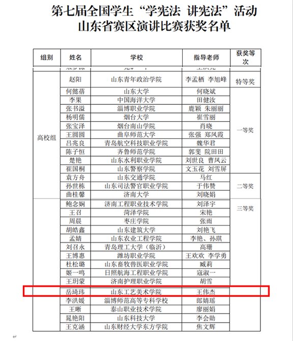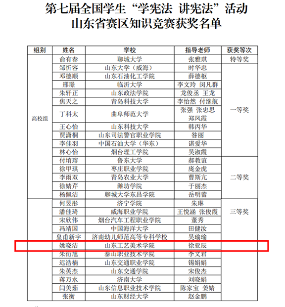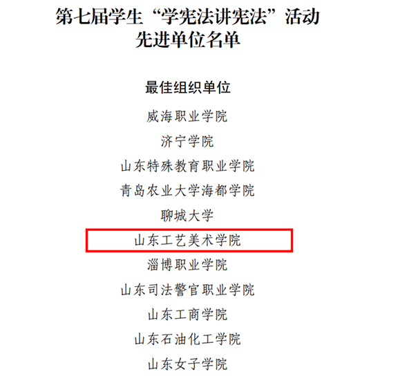 近日,省教育厅公布了《关于第七届学生“学宪法 讲宪法”活动开展情况的通报(鲁教法函〔2023〕1号)》,永利官网喜获13项集体和个人表彰。304am永利集团官网荣评“最佳组织单位”,数字艺术与传媒学院岳琦玮、人文艺术学院姚晓洁同学分别获第七届学生“学宪法 讲宪法”活动山东省赛区演讲比赛三等奖和知识竞赛三等奖,王伟杰、陈瑶、陈铁等十位老师获评第七届学生“学宪法 讲宪法”活动先进个人。