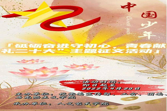 今年是党的二十大召开之年,是中国共产主义青年团建团100周年,也是学校深入推进特色鲜明、优势突出的高水平艺术与设计大学建设的关键之年。为深入贯彻落实习近平新时代中国特色社会主义思想,持续巩固深化党史学习教育成果,赓续青年学生“听党话、感党恩、跟党走”的红色基因,引领全校师生以更加饱满的热情、高昂的斗志和优异的成绩迎接党的二十大胜利召开,由党委宣传部、工会、团委、马克思主义学院主办,人文艺术学院团总支承办的“砥砺奋进守初心,青春献礼二十大”主题征文活动近日圆满落下帷幕。