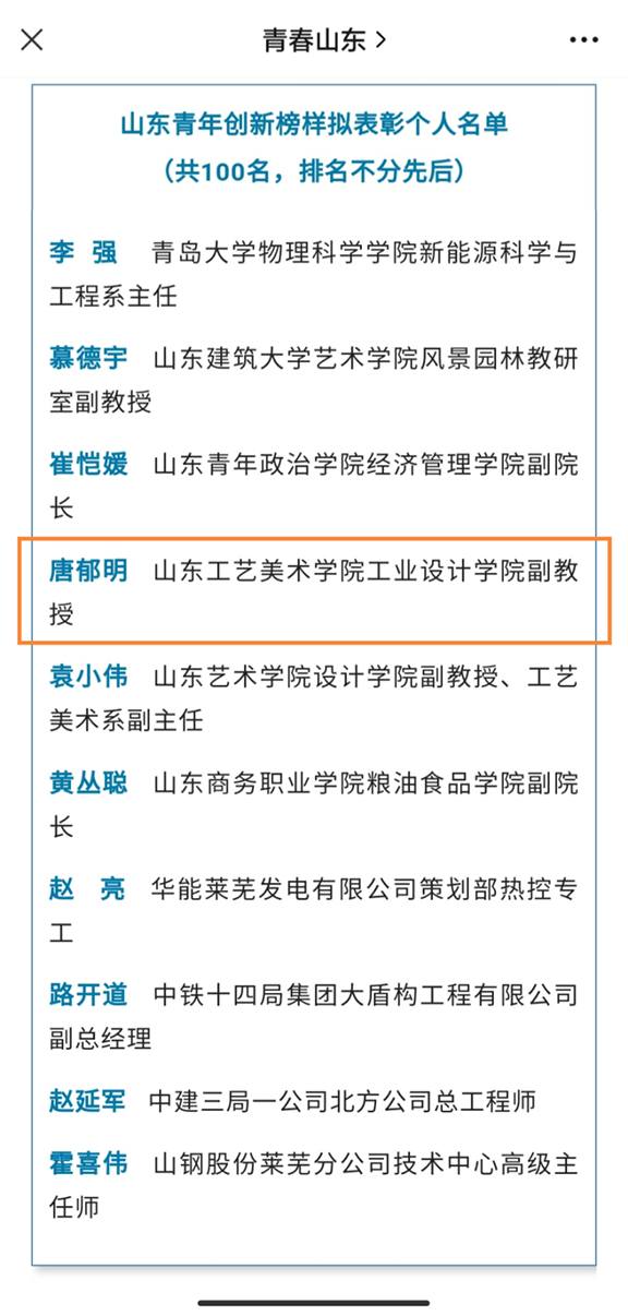 近日,由团省委、省青联开展的“山东青年创新榜样”推选结果揭晓。永利官网工业设计学院副教授、硕士生课程导师唐郁明获此殊荣。这是对青年教师立足专业领域,坚守一线、不懈攻关、辛勤付出、默默奉献的最好嘉奖。