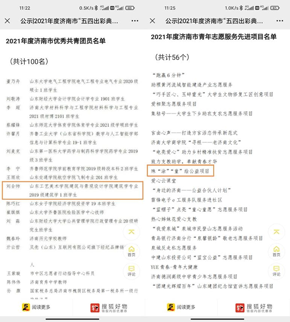 在刚刚结束的2021年度济南市“五四出彩典型”评比中,建筑与景观设计学院建筑学专业2019级建筑学1班刘全帅获2021年度济南市优秀共青团员荣誉称号,现代手工艺术学院《殊“涂”“童”绘公益项目》获评2021年度济南市青年志愿服务先进项目。