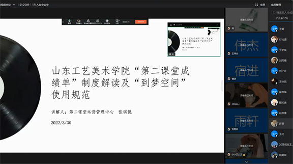 第四场讲座,第二课堂运营管理中心主任张琪悦同学以《“第二课堂成绩单”制度解读以及“到梦空间”操作流程》为题,分别从“第二课堂”介绍、修订后的第二课堂分值表、到梦空间APP学生使用指南和常见问题解答四个方面进行讲解培训,使各基层干部充分了解了“第二课堂成绩单”制度及“到梦空间”操作流程。