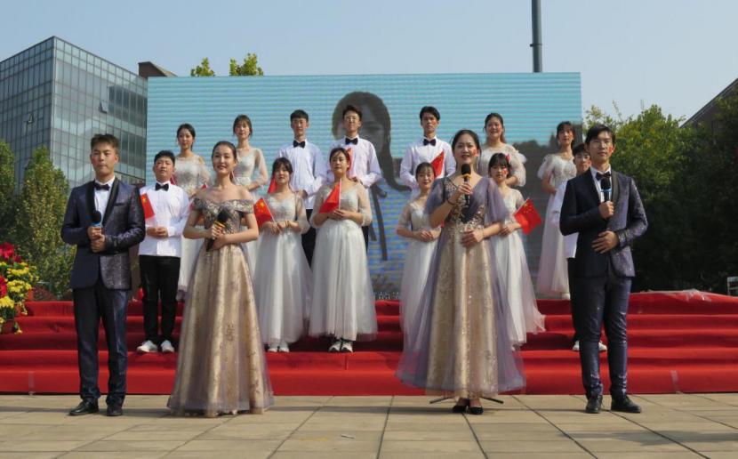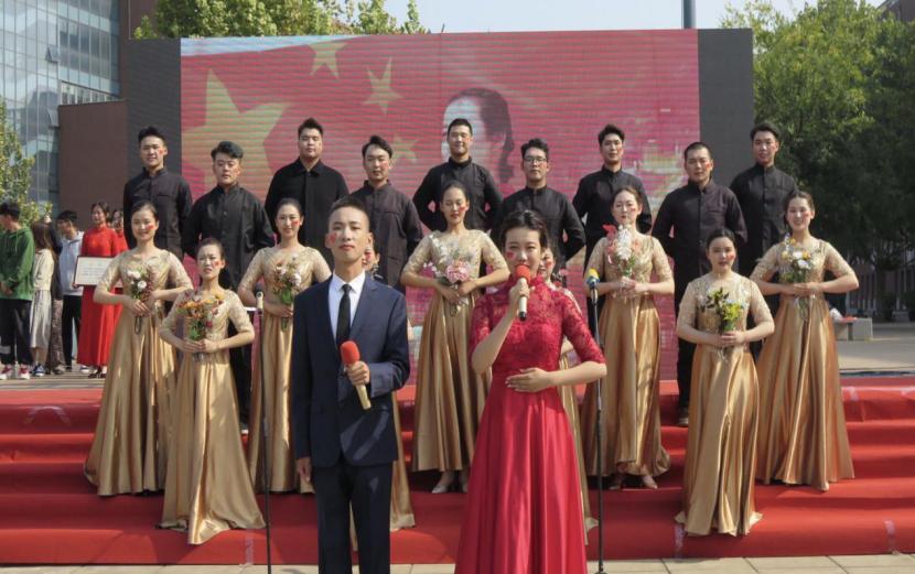 在展演现场,获得最佳人气奖的现代手工艺术学院20级代表队与获得一等奖的视觉传达艺术学院19级代表队进行了汇报表演,用最诚挚的祝福表达了学校青年学子对祖国的无限赞颂与美好祝愿。