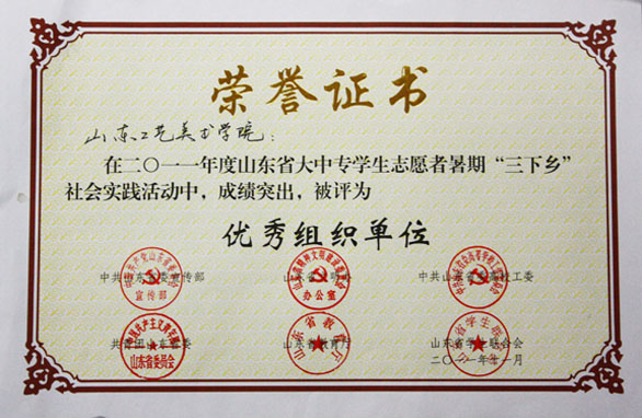近日,团省委关于《关于表彰2011年山东省大中专学生志愿者暑期“三下乡”社会实践活动先进集体和先进个人的决定》的文件已收到,304am永利集团官网被评为“优秀组织单位”,黄晓曼等7名老师被评为“优秀指导者”,侯信波等15名同学被评为“优秀学生”,“健康山东 我们先行”暑期社会实践分队等6支分队被评为“优秀服务队”。希望受到表彰的先进集体和个人认真总结经验,珍惜荣誉,再接再厉,勇于创新,在今后的实践活动中更好地发挥模范带头作用。