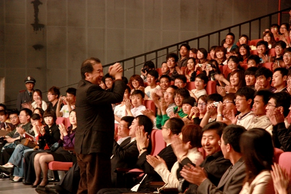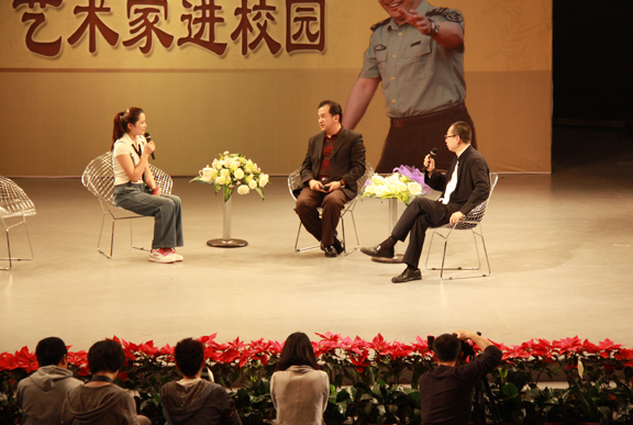 座谈会过程中,黄宏老师提到他13岁参军、14岁独立创作、16岁发表作品、成长过程中角色的转换、连续22年上春晚的经历,勉励同学们自信、自主,命运自己掌握,对于想当兵的同学,即使是艺术类学生只要具备了一技之长同样可以在部队里找到自己的位置,并谈到自己在艺术创作过程中的感受及经验,诠释了他成功塑造农民工角色的原因。作为政协委员,他做了两个关于农民工的提案,并要求将所有参与建造鸟巢的农民工的名字刻在鸟巢建筑物上。