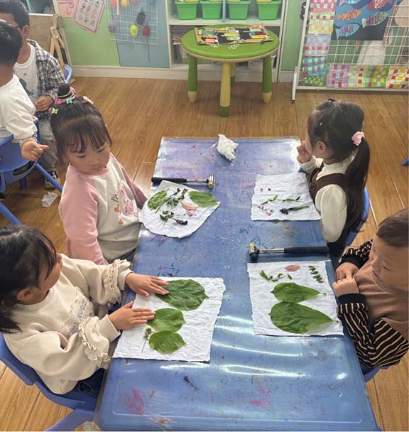 在志愿者的耐心指导下,孩子们手持小锤,小心翼翼地敲打植物,让植物的汁液一点点渗透到布料中,随着敲打的进行,原本洁白的布料上逐渐显现出植物的轮廓与色彩,一幅幅精美的植物拓印作品初具雏形。小朋友们看到自己的劳动成果,脸上洋溢着自豪与喜悦的笑容,他们互相展示自己的作品,兴奋地讨论着每一片叶子和花瓣的细节,志愿者们也鼓励孩子们发挥创意,尝试不同的植物组合,创造出更多独特的图案。