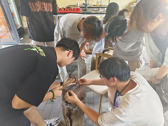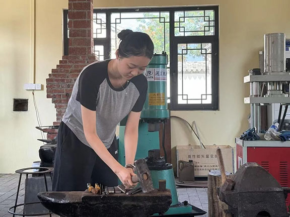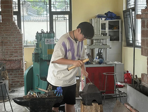 近年来,济南市钢城区在传统工艺振兴中积极探索,依托澜头村传统铁艺技艺,促进非遗与产业融合,取得了卓有成效的实践成果,进而推动了铁艺技艺创造性转化与乡村振兴深度融合。实践团队第二站抵达钢城区澜头村铁器制作中心。通过参观古铁坊与冶铁坊和铁艺传承人亓振老师的详细讲解,团队成员深入了解中国铁器的演变历程——从战国时期的束腰斧到新中国成立前后的铁斧,以及铁器制作从选料炼铁到成型打磨的完整工序链。在实地体验环节,成员们在亓振老师的指导下亲手实践了锻打与篆刻这两道关键工艺。看似重复繁杂的锤击,实则最考验匠人对火候的精准把握与力道的娴熟掌控。每一件成品铁器,都凝聚着工匠们倾注的耐心与智慧。