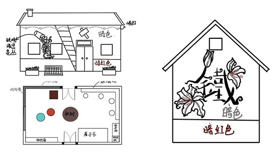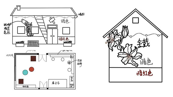 室内外设计方面,应“一颜万年”研学基地的需求,从实用、美观的角度出发,成员们对冶铁坊的室内外进行了空间设计改造。在设计方案的同时,仍保留了铁匠铺原有的古朴木梁、斑驳墙壁,这些岁月的痕迹是铁匠铺的灵魂所在。在此基础上进行了方案的设计改造。室外设计方案中室外主用暗色调墙绘,体现出铁艺的厚重感和工业化风格,侧墙“铁字开花”彩绘则展现其细腻一面,房檐的小夜灯兼顾实用与浪漫氛围。室内设计则创新引入熔炉旁的“洞洞墙”,并与协调的墙绘相搭配。装饰取材传统铁画,以铁质材料为主,对内部空间布局进行高效规整,成功将澜头深厚历史底蕴与现代设计、精湛工艺相结合,为文化传承注入崭新活力。