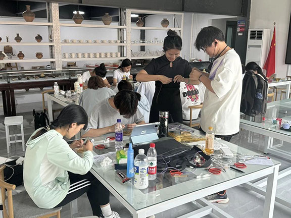 (图为实践团队成员亲身体验铜胎掐丝珐琅制作)