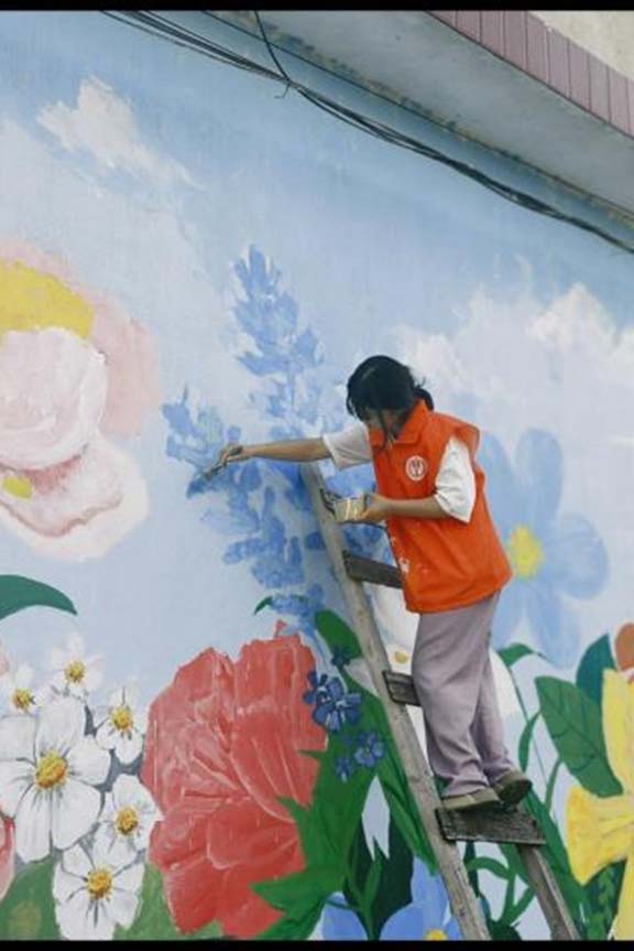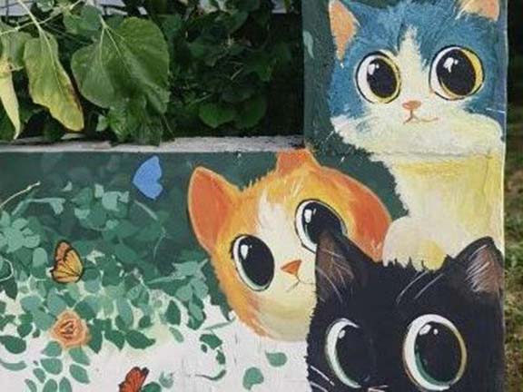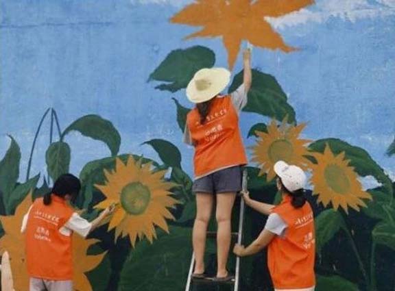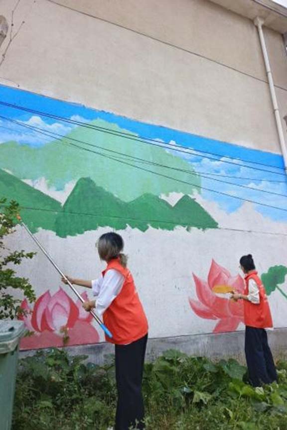 志愿者们化身“乡土画师”,走遍小杏花村的街巷角落,把斑驳墙面变成了承载村庄记忆与发展愿景的鲜活载体。志愿者紧扣村子的农耕底色与民俗风情,将金黄的麦田、忙碌的农民伯伯、硕果累累的果树融入画面,让乡土气息扑面而来;还加入“绿水青山就是金山银山”“新时代乡村风尚”等理念,用生动线条勾勒生态宜居的图景,用明快色彩传递文明新风。