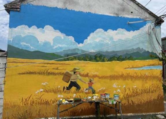 在绘制过程中,志愿者们克服天气炎热、蚊虫叮咬等难题,一笔一画勾勒:给老农的皱纹添上几分真实,让稻穗的颗粒感更显饱满,为村头的老树补上几片新叶。原本单调的墙面渐渐“活”了起来,成为诉说小杏花村故事、传递精神力量的文化新地标。