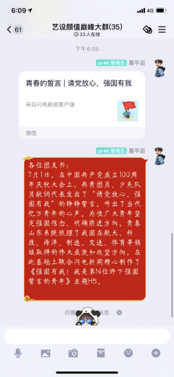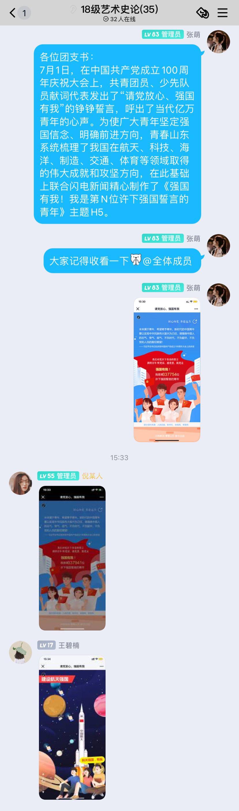 为使同学们坚定强国信念、明确前进方向,引导青年学生立志强国、投身报国,7月29日,人文艺术学院团总支举办了“请党放心,强国有我”的主题团日活动,各基层团支部积极响应,纷纷开展线上主题云团课。通过观看精心制作的H5动画,聆听深入浅出的讲解,分析两个百年目标的转变,以面向历史、现在和未来为跨度,贯通“四个伟大、三个方面”,人文学子对“请党放心,强国有我”这句话有了更为深刻的理解。