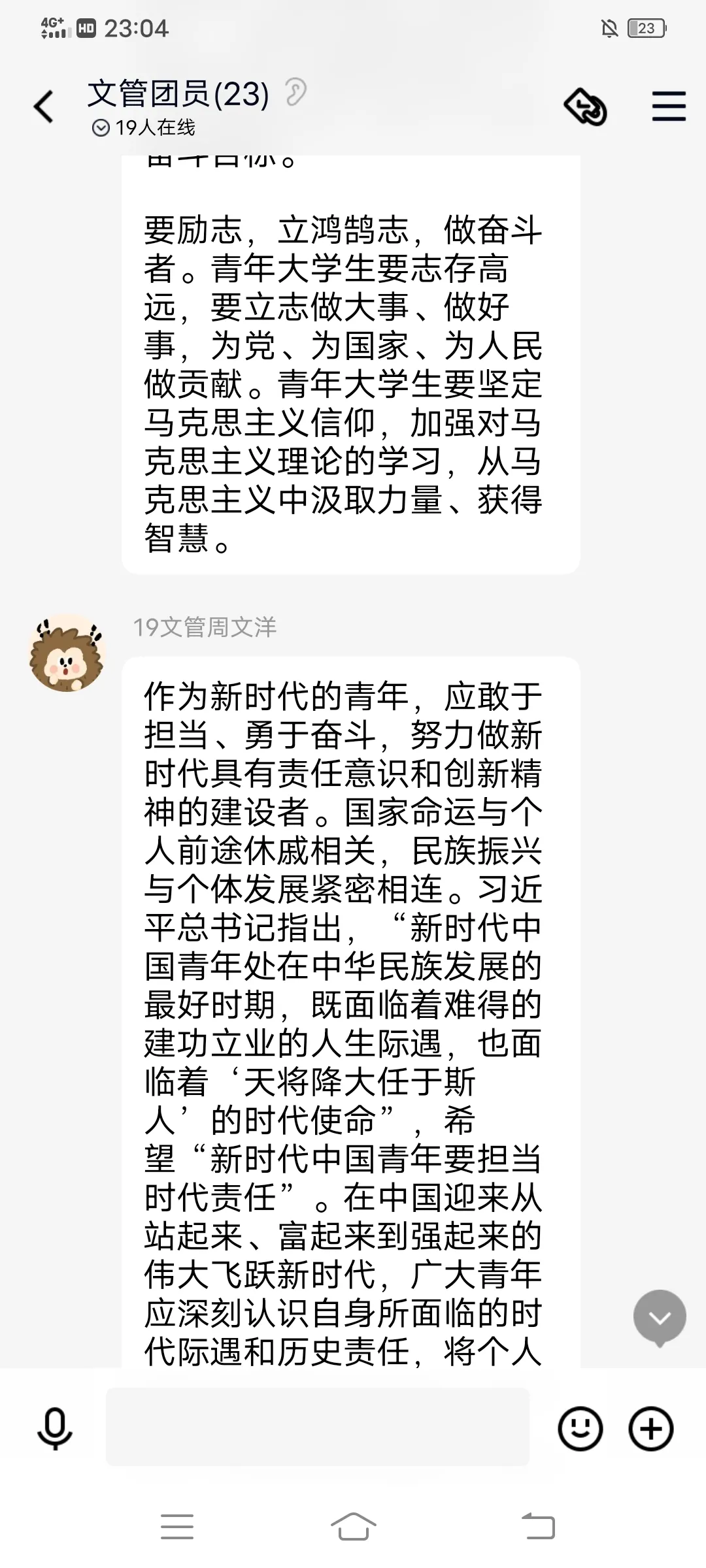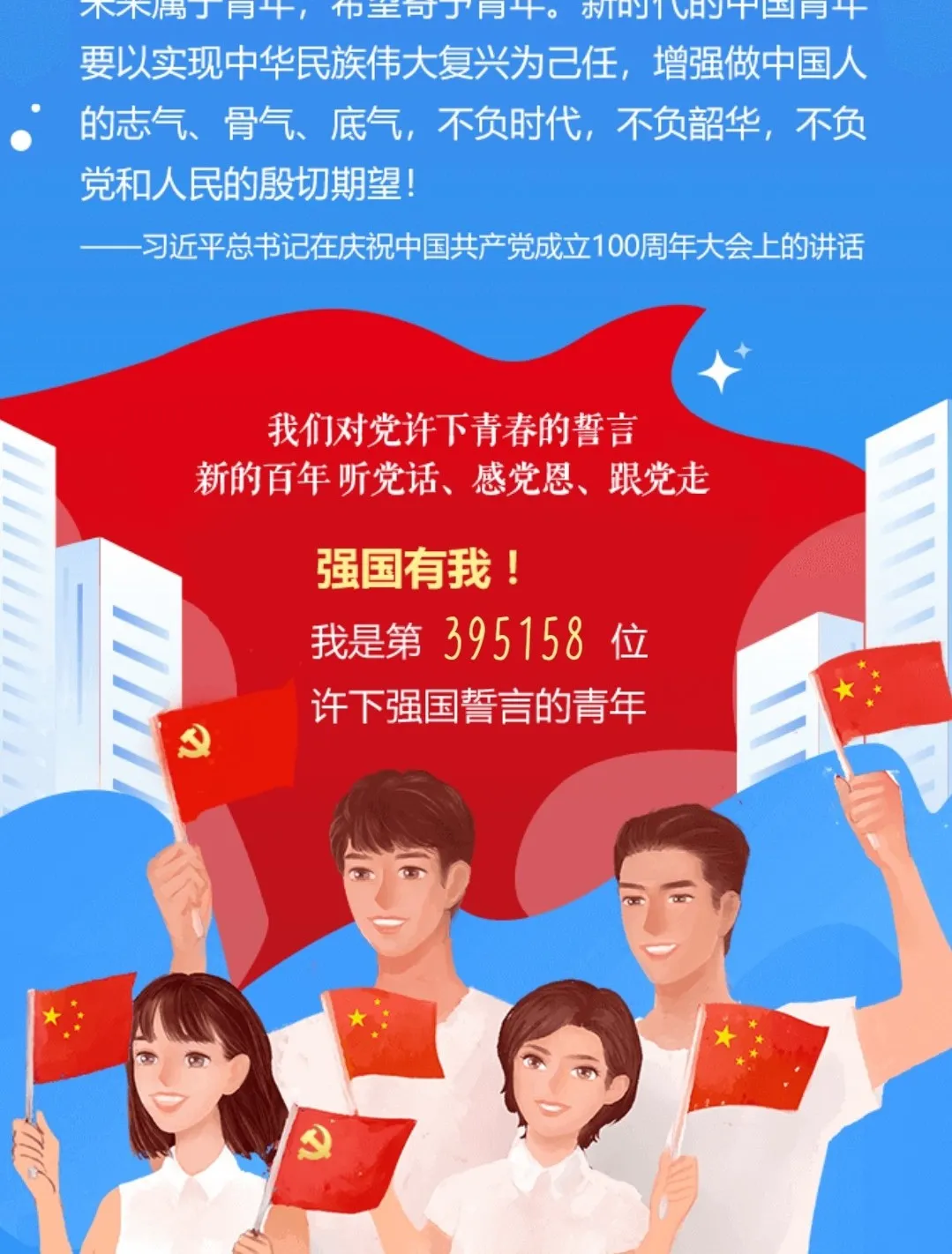 “未来属于青年,希望寄予青年。”习近平总书记特别强调,“新时代的中国青年要以实现中华民族伟大复兴为己任,增强做中国人的志气、骨气、底气,不负时代,不负韶华,不负党和人民的殷切期望”。大学生代表着国家的希望和民族的未来,新时代的年轻人,是有远大理想的一代,也一定是能够担当大任的一代。百年之前,风雨如晦的旧中国,正是一群觉醒的新青年,高举起思想的火炬。今天,风云激荡的新时代,21世纪的新青年,正信心满怀准备着接过时代的接力棒。“奋斗正青春,青春献给党。请党放心,强国有我!”这是亿万青少年的铮铮誓言,这是亿万青少年对党和人民的郑重承诺,这是亿万青少年对世界的庄严表白。