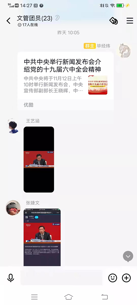 2021年11月8日至11日,中国共产党第十九届中央委员会第六次全体会议在北京胜利召开。11月12日,人文艺术学院团总支组织开展“学习贯彻党的十九届六中全会精神”主题团日活动,各团支部以个人、宿舍、班级为单位观看新闻发布会。