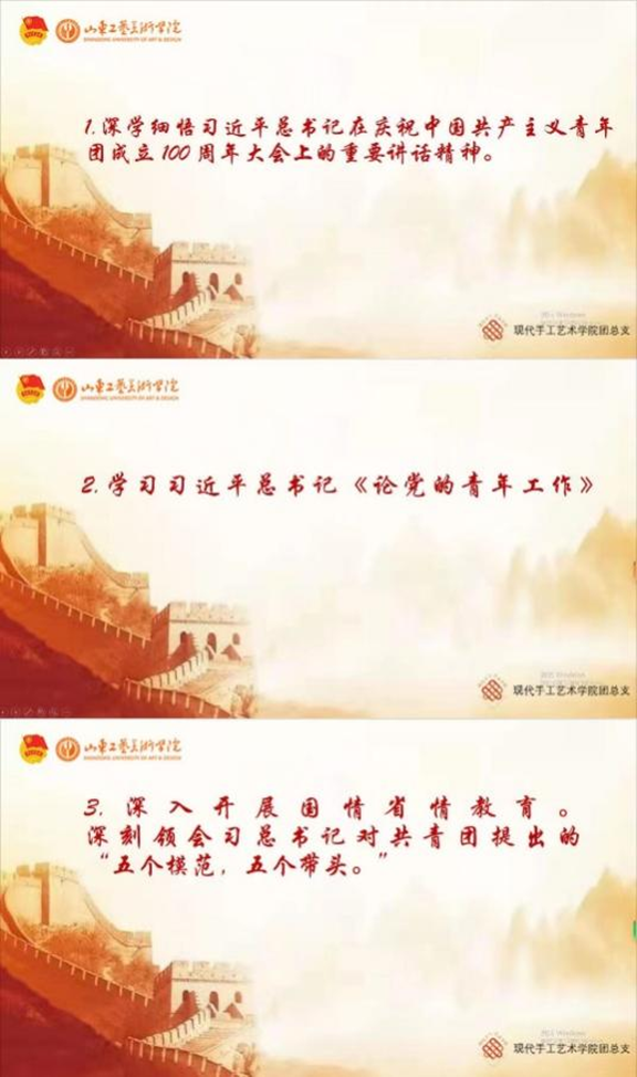 为深入学习贯彻习近平总书记在庆祝中国共产主义青年团成立100周年大会上的重要讲话精神,教育引导广大青少年在回顾党的青年运动史中赓续红色血脉,以优异成绩迎接党的二十大胜利召开。2022年9月4日,现代手工艺术学院团总支组织召开新学期共青团第一课。