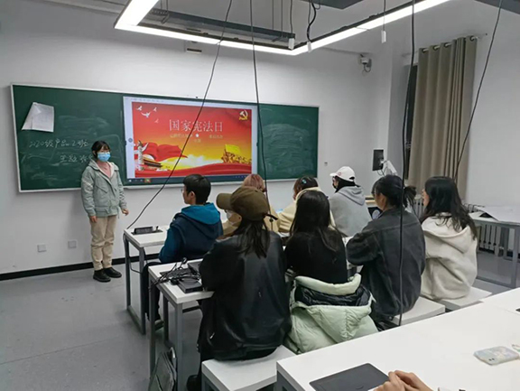 在此次团日活动中,各团支部成员重点围绕宪法的实施、宪法的贯彻和弘扬宪法精神三个主题,作了深入浅出的解读,并且组织各位团员青年在教育部全国青少年普法网进行学习答题。在基层团支部中进一步弘扬了法治精神,鼓励同学们做遵法学法守法用法的青年先锋。