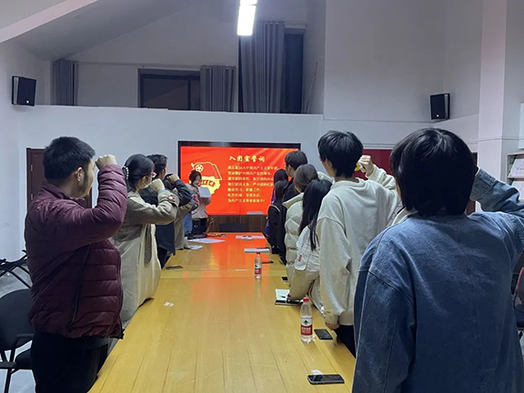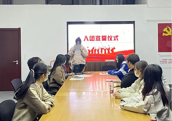 本次入团仪式分三部分展开。仪式进行第一项,全体团员面向国旗唱国歌,团总支委员殷玉娇向各位新团员说明举行入团仪式的重要意义,并宣读新团员名单。随后,由团总支委员为新团员代表颁发团徽,老团员为新成员佩戴团徽,全体团员面向团旗完成庄严的入团宣誓。